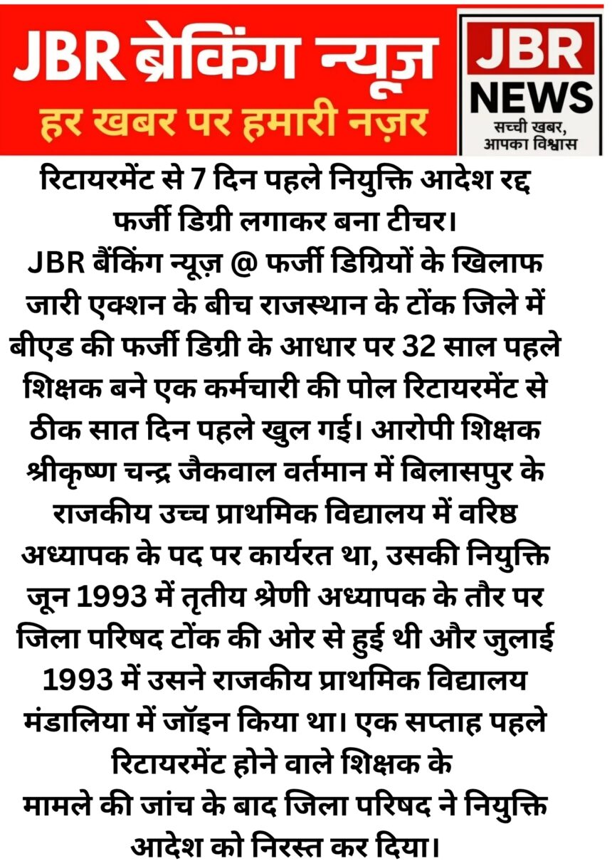 JBR बैंकिंग न्यूज़ @ फर्जी डिग्रियों के खिलाफ जारी एक्शन के बीच राजस्थान के टोंक जिले में बीएड की फर्जी डिग्री के आधार पर 32 साल पहले शिक्षक बने एक कर्मचारी की पोल रिटायरमेंट से ठीक सात दिन पहले खुल गई। आरोपी शिक्षक श्रीकृष्ण चन्द्र जैकवाल वर्तमान में बिलासपुर के राजकीय उच्च प्राथमिक विद्यालय में वरिष्ठ अध्यापक के पद पर कार्यरत था, उसकी नियुक्ति जून 1993 में तृतीय श्रेणी अध्यापक के तौर पर जिला परिषद टोंक की ओर से हुई थी और जुलाई 1993 में उसने राजकीय प्राथमिक विद्यालय मंडालिया में जॉइन किया था। एक सप्ताह पहले रिटायरमेंट होने वाले शिक्षक के मामले की जांच के बाद जिला परिषद ने नियुक्ति आदेश को निरस्त कर दिया।