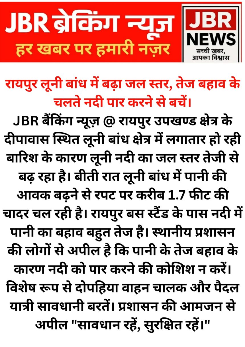 JBR बैंकिंग न्यूज़ @ रायपुर उपखण्ड क्षेत्र के दीपावास स्थित लूनी बांध क्षेत्र में लगातार हो रही बारिश के कारण लूनी नदी का जल स्तर तेजी से बढ़ रहा है। बीती रात लूनी बांध में पानी की आवक बढ़ने से रपट पर करीब 1.7 फीट की चादर चल रही है। रायपुर बस स्टैंड के पास नदी में पानी का बहाव बहुत तेज है। स्थानीय प्रशासन ने लोगों से अपील की है कि तेज बहाव के कारण नदी को पार करने की कोशिश न करें। विशेष रूप से दोपहिया वाहन चालक और पैदल यात्री सावधानी बरतें। प्रशासन की आमजन से अपील “सावधान रहें, सुरक्षित रहें।”