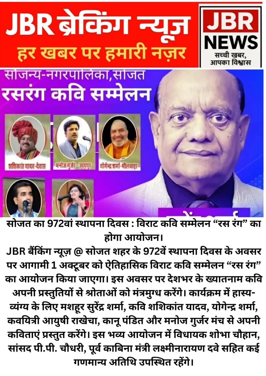 JBR बैंकिंग न्यूज़ @ सोजत शहर के 972वें स्थापना दिवस के अवसर पर आगामी 1 अक्टूबर को ऐतिहासिक विराट कवि सम्मेलन “रस रंग” का आयोजन किया जाएगा। इस अवसर पर देशभर के ख्यातनाम कवि अपनी प्रस्तुतियों से श्रोताओं को मंत्रमुग्ध करेंगे। कार्यक्रम में हास्य-व्यंग्य के लिए मशहूर सुरेंद्र शर्मा, कवि शशिकांत यादव, योगेन्द्र शर्मा, कवयित्री आयुषी राखेचा, कानू पंडित और मनोज गुर्जर मंच से अपनी कविताएं प्रस्तुत करेंगे। इस भव्य आयोजन में विधायक शोभा चौहान, सांसद पी.पी. चौधरी, पूर्व काबिना मंत्री लक्ष्मीनारायण दवे सहित कई गणमान्य अतिथि उपस्थित रहेंगे।