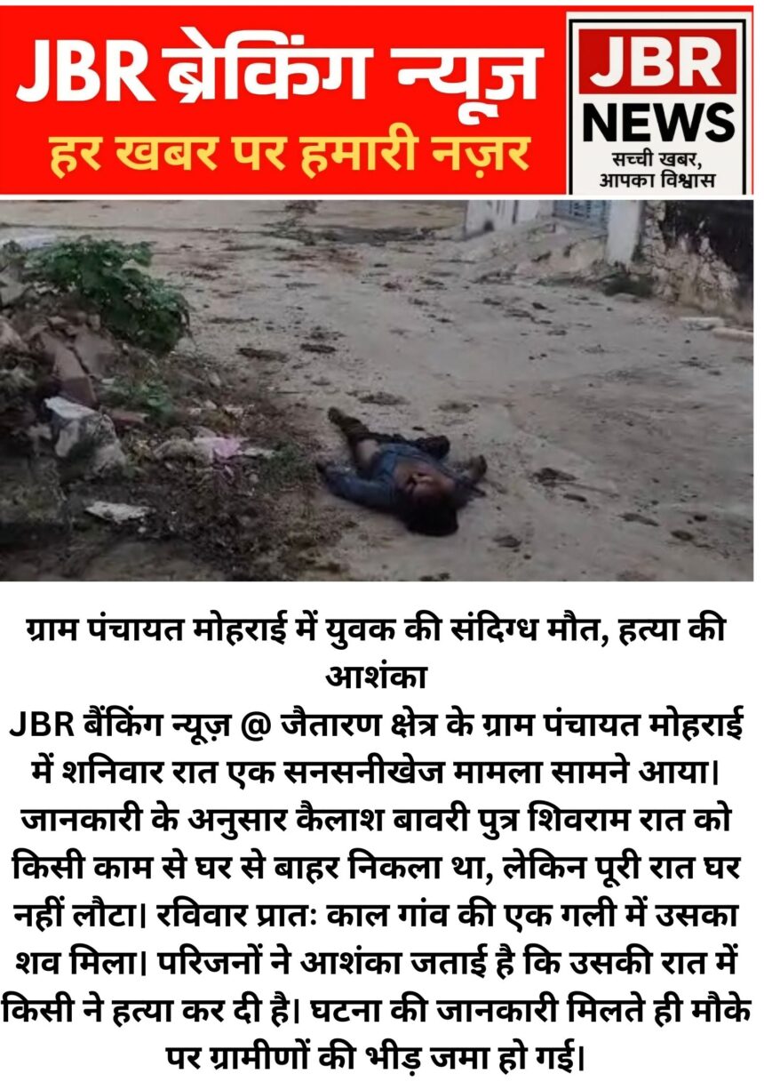 JBR बैंकिंग न्यूज़ @ जैतारण क्षेत्र के ग्राम पंचायत मोहराई में शनिवार रात एक सनसनीखेज मामला सामने आया। जानकारी के अनुसार कैलाश बावरी पुत्र शिवराम रात को किसी काम से घर से बाहर निकला था, लेकिन पूरी रात घर नहीं लौटा। रविवार प्रातः काल गांव की एक गली में उसका शव मिला। परिजनों ने आशंका जताई है कि उसकी रात में किसी ने हत्या कर दी है। घटना की जानकारी मिलते ही मौके पर ग्रामीणों की भीड़ जमा हो गई।