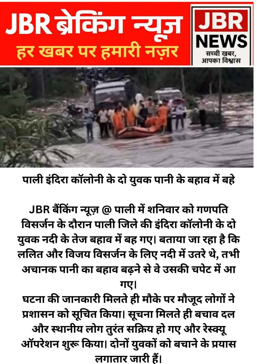 JBR बैंकिंग न्यूज़ @ पाली में शनिवार को गणपति विसर्जन के दौरान पाली जिले की इंदिरा कॉलोनी के दो युवक नदी के तेज बहाव में बह गए। बताया जा रहा है कि ललित और विजय विसर्जन के लिए नदी में उतरे थे, तभी अचानक पानी का बहाव बढ़ने से वे उसकी चपेट में आ गए।घटना की जानकारी मिलते ही मौके पर मौजूद लोगों ने प्रशासन को सूचित किया। सूचना मिलते ही बचाव दल और स्थानीय लोग तुरंत सक्रिय हो गए और रेस्क्यू ऑपरेशन शुरू किया। दोनों युवकों को बचाने के प्रयास लगातार जारी हैं।घटना की सूचनाथ पर प्रशासन के अधिकारी तुरंत घटनास्थल पर पहुंचे ।